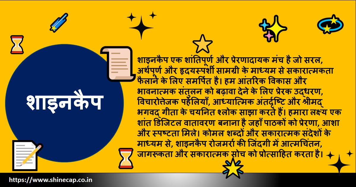 शाइनकैप एक शांतिपूर्ण और प्रेरणादायक मंच है, जिसे सरल और अर्थपूर्ण सामग्री के माध्यम से सकारात्मकता फैलाने के लिए बनाया गया है। यहाँ हम प्रेरक उद्धरण, रोचक पहेलियाँ, आध्यात्मिक विचार और श्रीमद् भगवद् गीता के चयनित श्लोक साझा करते हैं। हमारा उद्देश्य एक शांत वातावरण बनाना है जहाँ पाठक प्रेरणा, आशा और भावनात्मक संतुलन पा सकें। विचारशील शब्दों और सौम्य संदेशों के माध्यम से, शाइनकैप आत्मचिंतन, आंतरिक शांति और रोजमर्रा की जिंदगी में सकारात्मक सोच को बढ़ावा देता है।